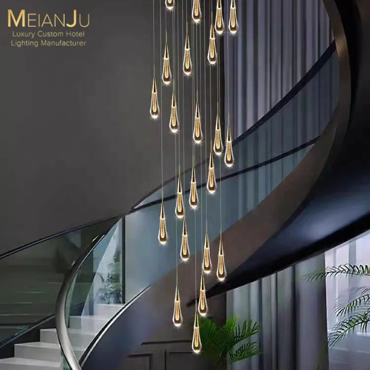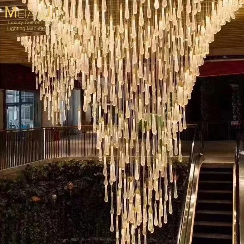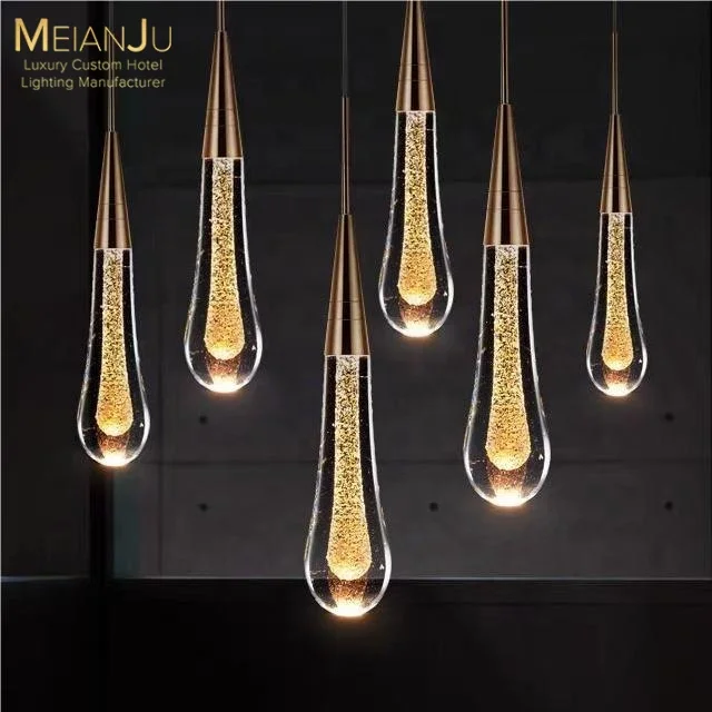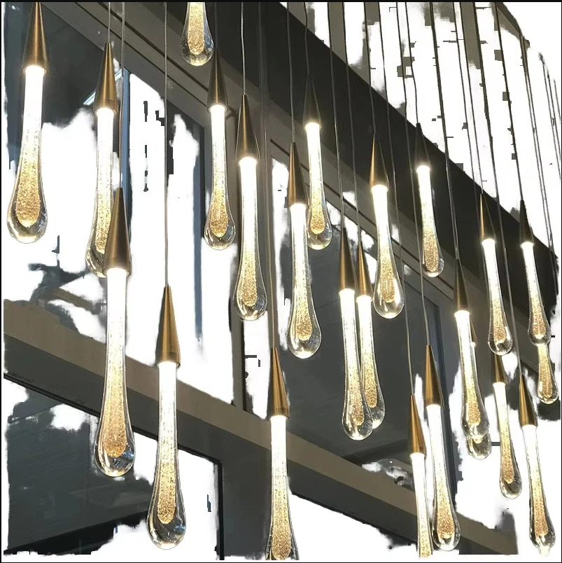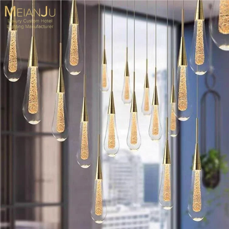 Elegant Simple Luxury 3000K Long Hanging Light Water Drop Crystal Pendant Small Gold LED Dimmable Loft Villa Duplex Lighting